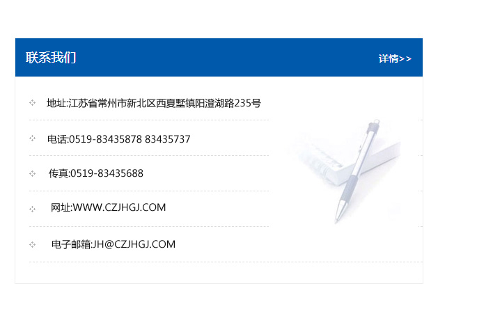 地址:常州市新北區友邦商務大廈1幢16、17層  電話:0519-85101652  傳真:0519-85112595  郵編:213022  網址:www.cz-jiayue_cn.jnlyl.com  郵箱:xiajifengaa@163.com